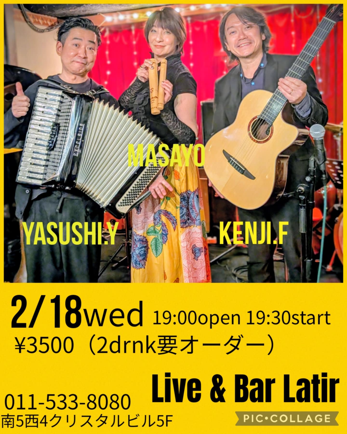 Live & Bar Latir(公式サイト) 札幌市中央区南5条西4丁目 クリスタルビル5F 19:00 open / 19:30 start ¥3,500(2 drink要オーダー) 山下ヤスシ Pf/Accordion, 古舘賢治 Gt/Vo, Masayo Vo
